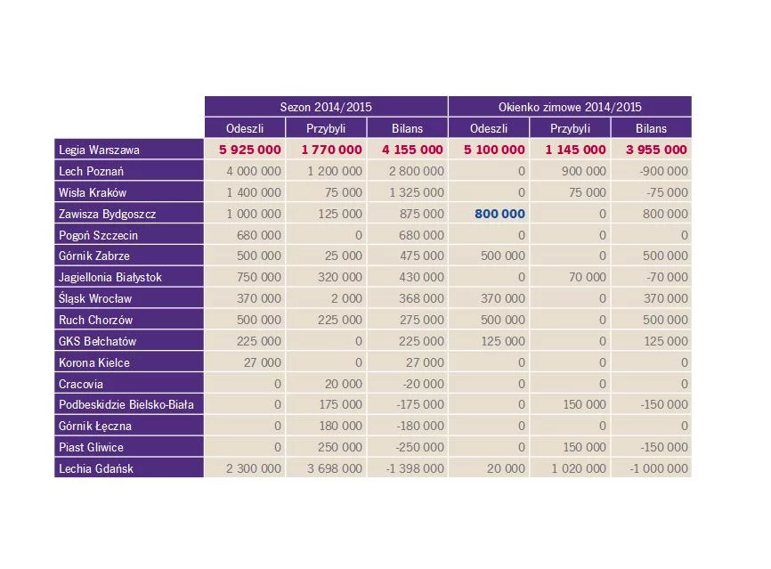 Dominację Legii na rynku transferowym w sezonie 2014/2015 najlepiej obrazuje okienko zimowe, kiedy to klub zarobił na transferach aż pięciokrotnie więcej niż drugi w tym zestawieniu Zawisza Bydgoszcz. Co ważne, tak dobra pozycja klubu z Bydgoszczy w okienku zimowym 2014/2015 to zasługa tylko jednego transferu – Michała Masłowskiego – który trafił nie gdzie indziej, jak do klubu ze stolicy.
